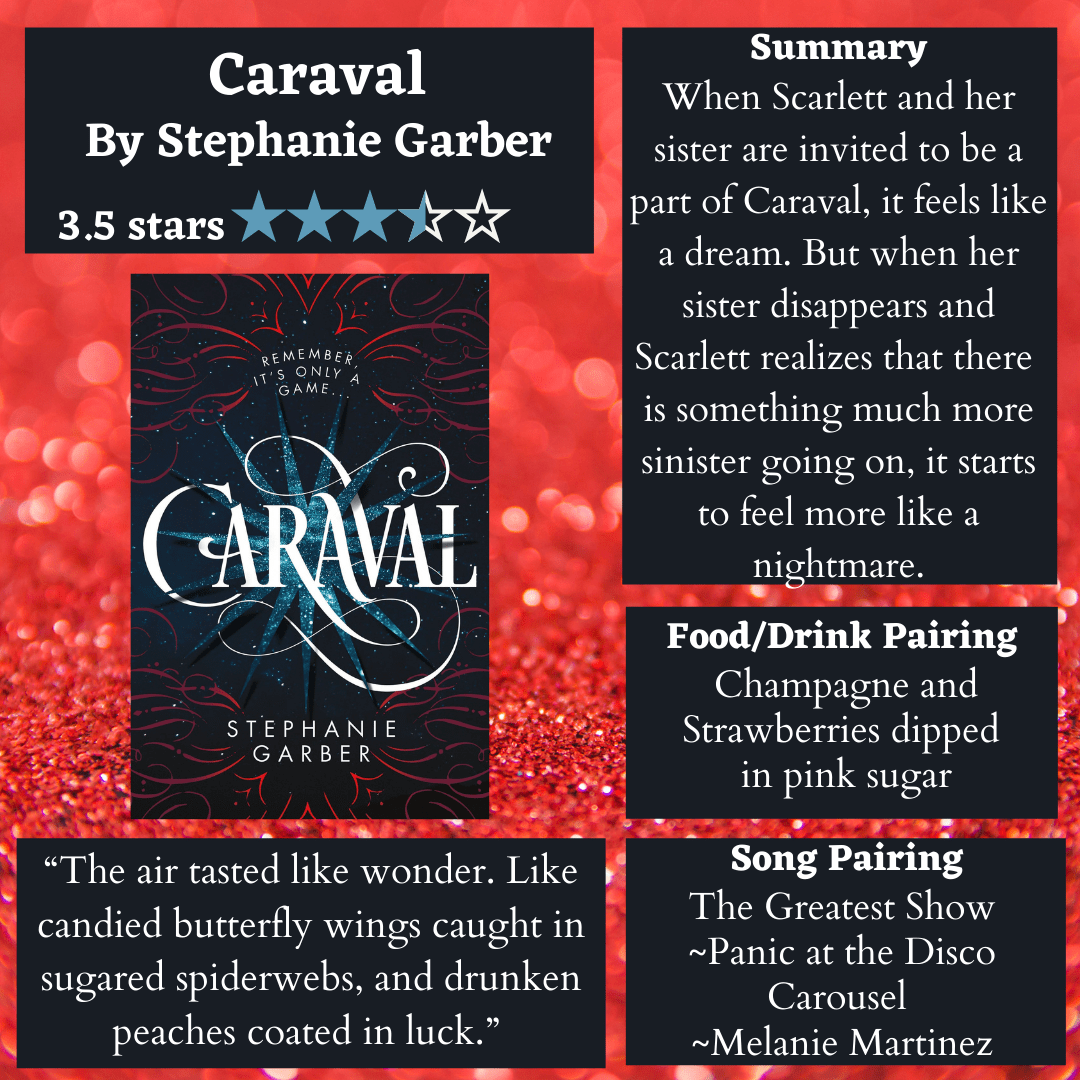 Scarlett Dragna and her sister Tella, have always dreamed of seeing Caraval, a traveling performance that hasn’t come to their island in years. Scarlett began writing letters to the shows proprietor when she was just a small girl. This year, a response finally arrived and they have been invited to be a part of the game. Scarlett and Tella are swept into the world of Caraval, but it isn’t the world they always dreamed of. They can’t tell what is real and what is just a part of the performance. Scarlett loses Tella, doesn’t know who to trust, and before the 5 nights of the game are over, her dream feels more like a nightmare.